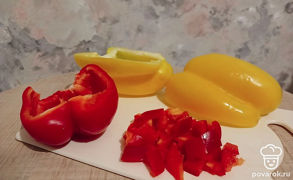 Перцы помойте. Разрежьте пополам, уберите косточки. Половинку одного перца нарежьте небольшими кусочками, примерно сантиметр на сантиметр.
