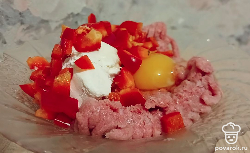 К фаршу добавьте нарезанный перец, брынзу, майонез и яйцо. Посолите и перемешайте.