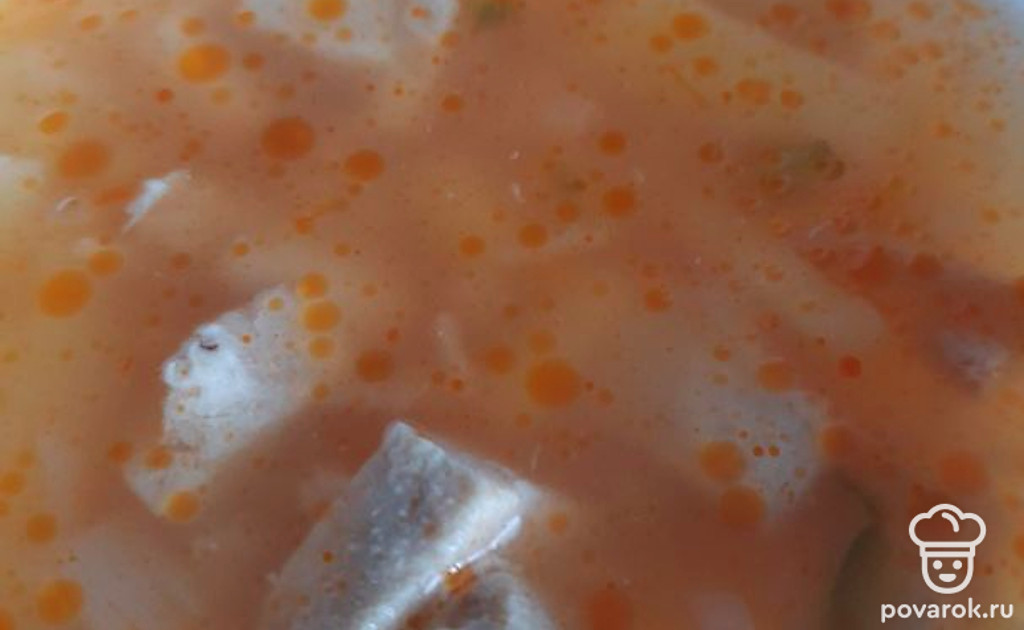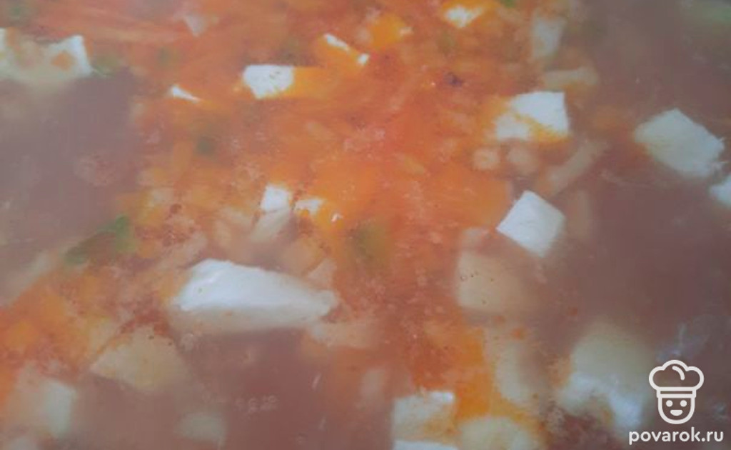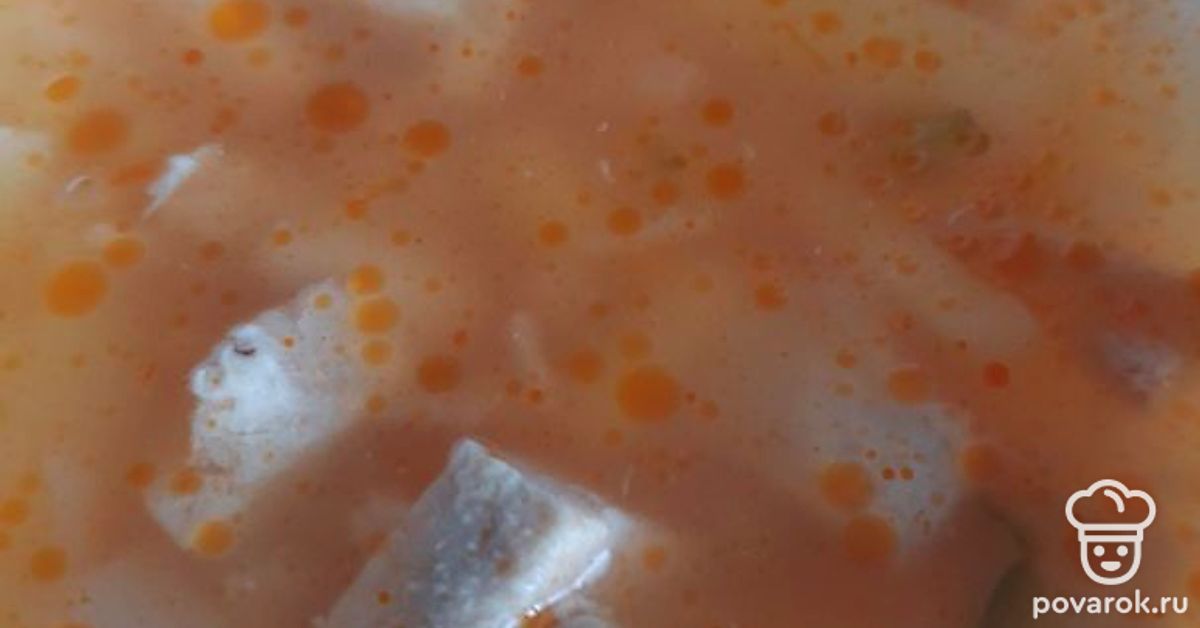 Лук, морковь и болгарский перец обжарьте в смеси подсолнечного и сливочного масел с томатной пастой. Добавьте получившуюся заправку в бульон.
