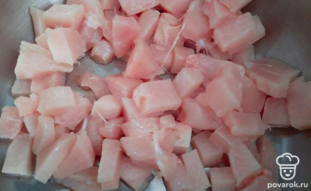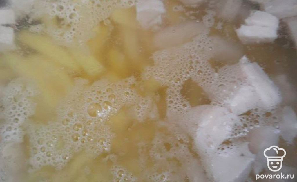 Картофель очистите, нарежьте и положите в кипящий бульон.