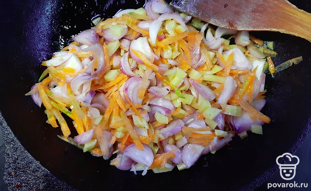 Обжарьте овощи на растительном масле, пока лук не станет прозрачным.