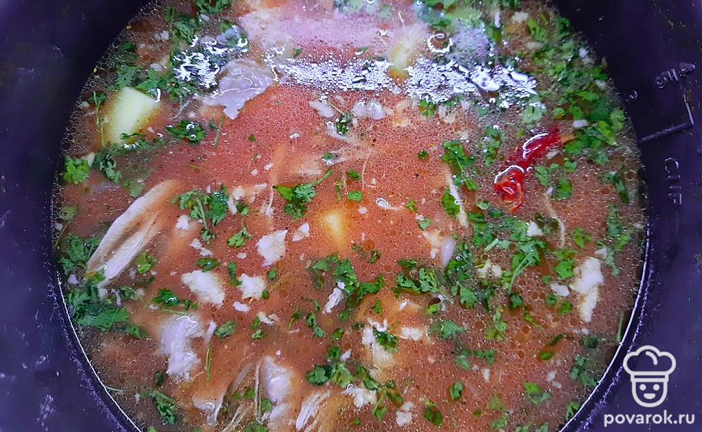 Посолите, положите стручок жгучего перца и пучок сушеной петрушки.