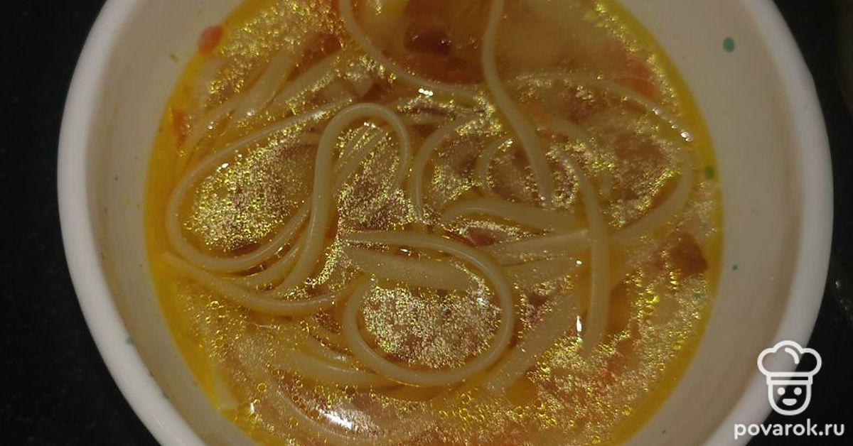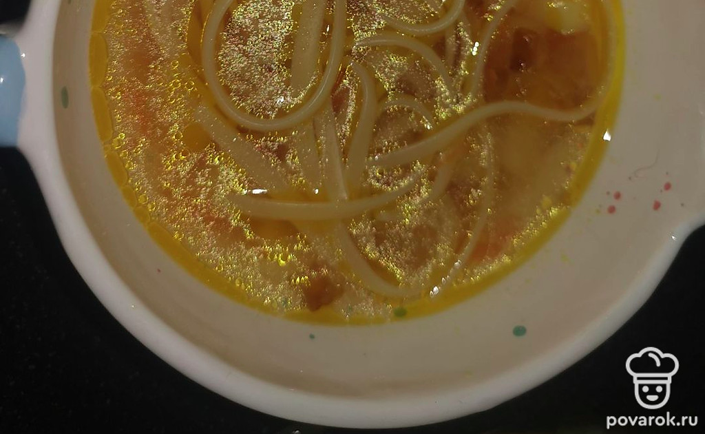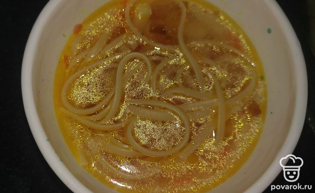 В отдельной кастрюле отварите спагетти и добавьте в суп.