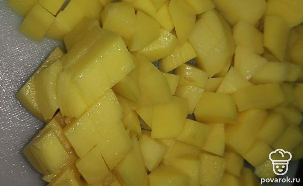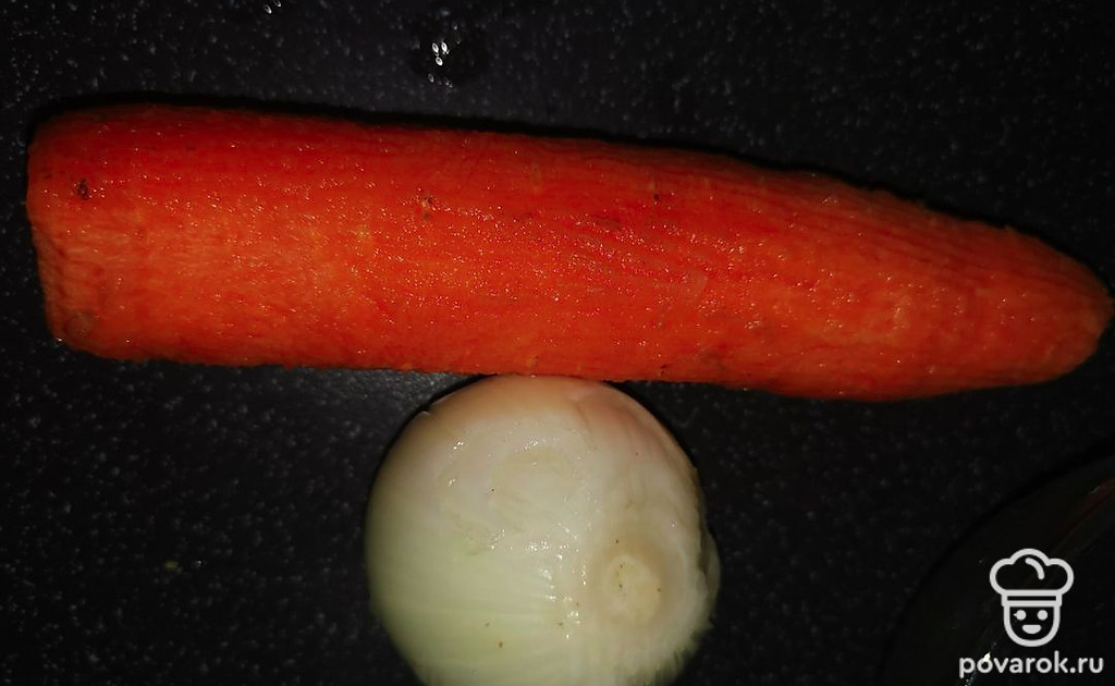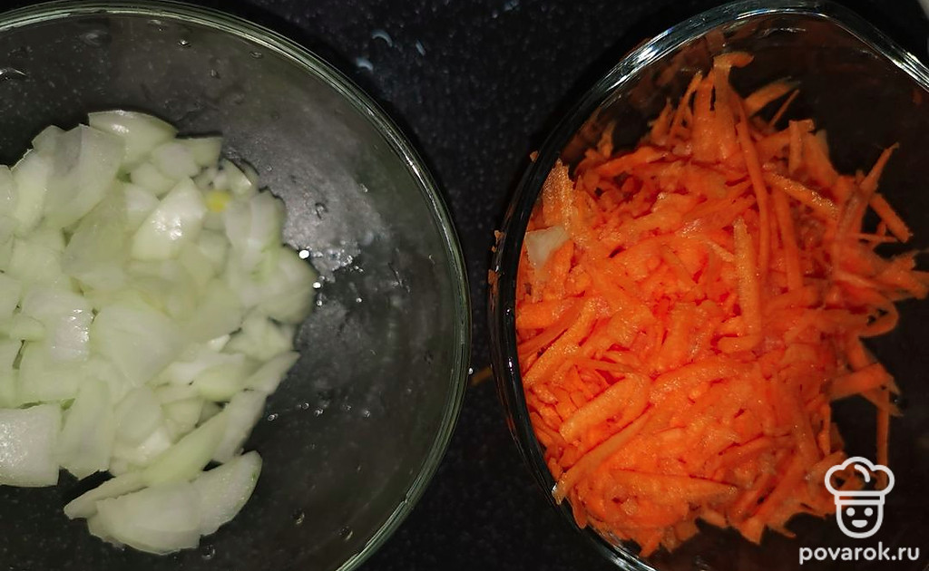 Натрите морковь на крупной тёрке и нарежьте лук квадратиками.