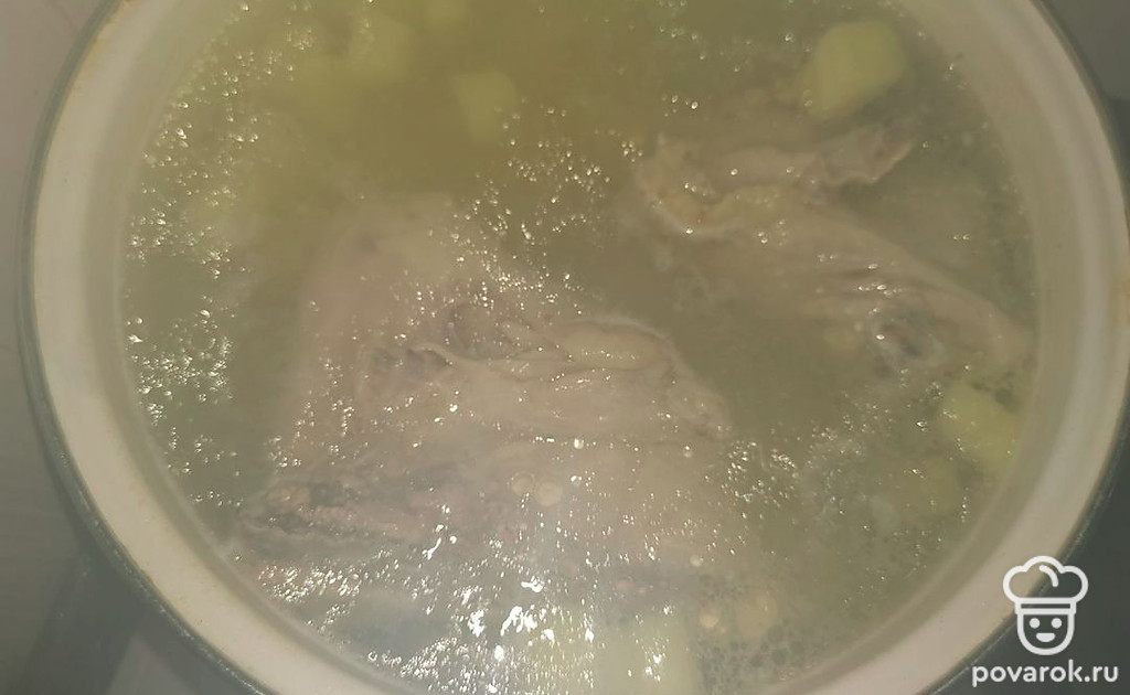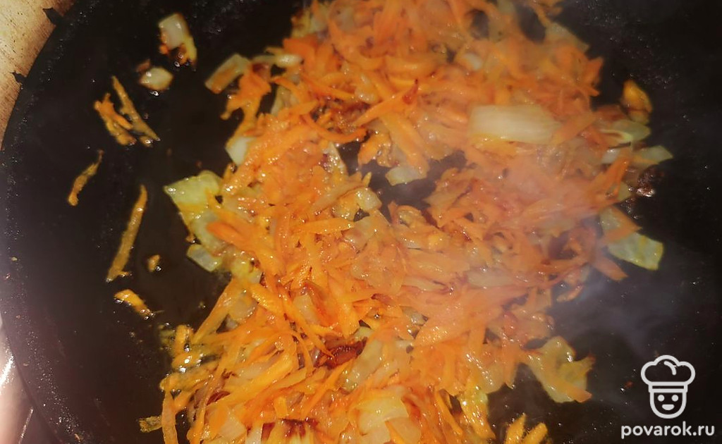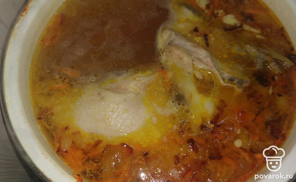 После того как суп постоит на медленном огне минут 40, добавьте в него зажарку из моркови и лука и варите ещё минут 20.