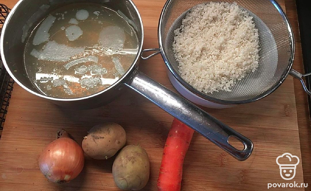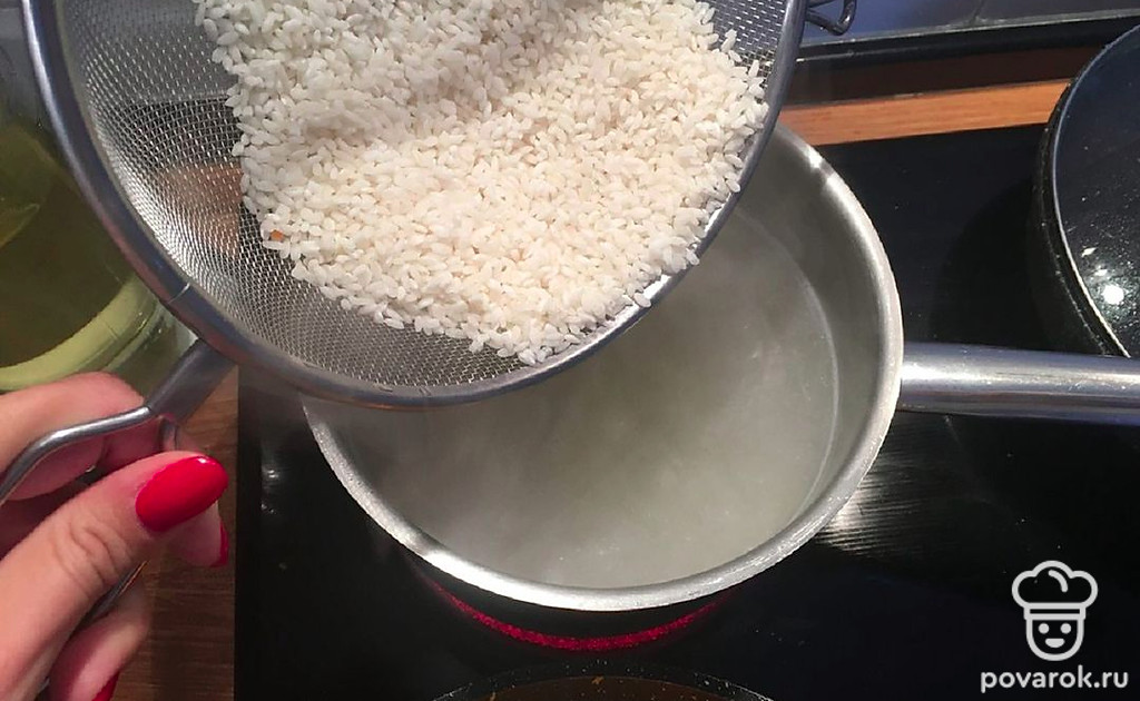 Разогрейте бульон на плите. Когда он закипит, добавьте рис.