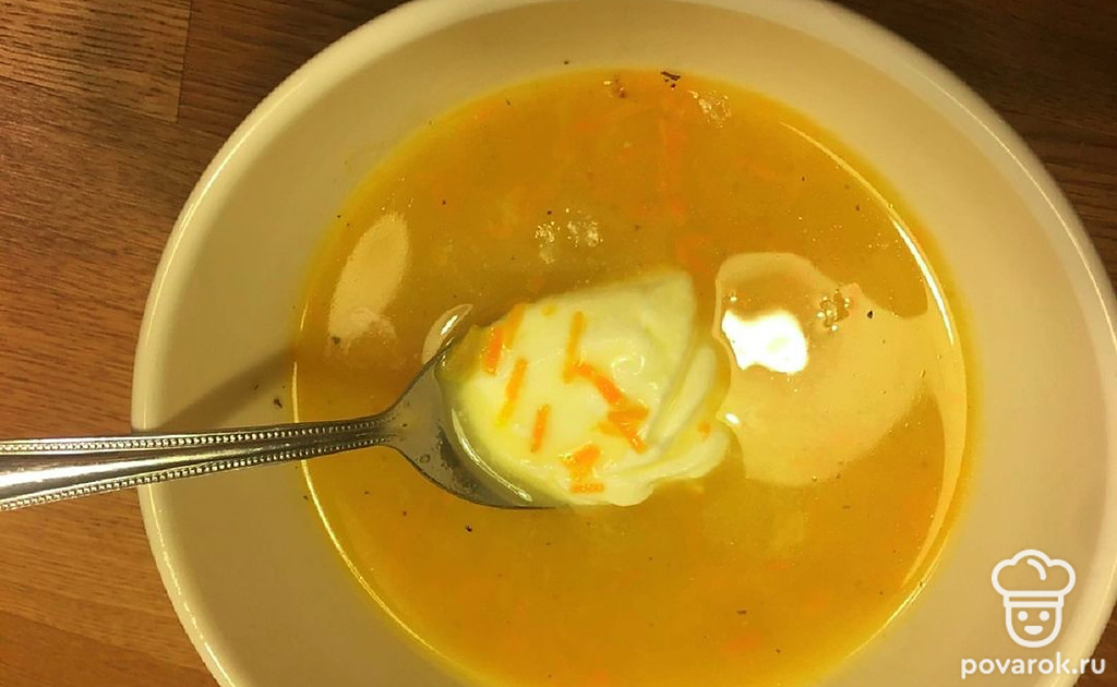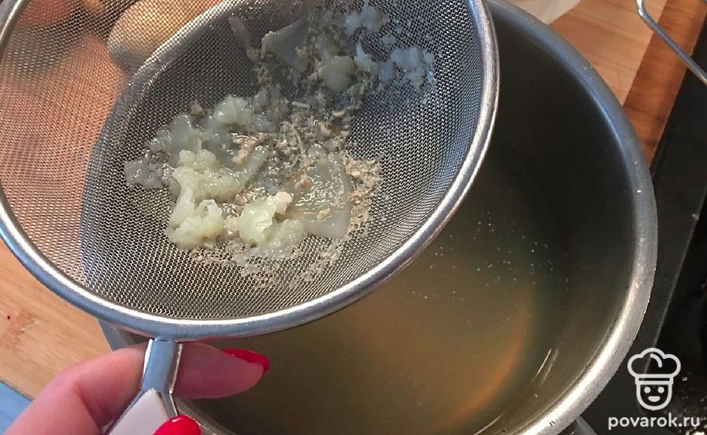 Пропустите бульон через сито, чтобы он стал прозрачным.