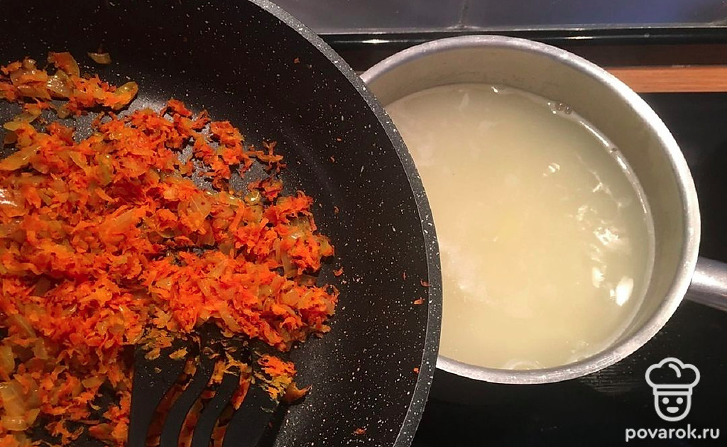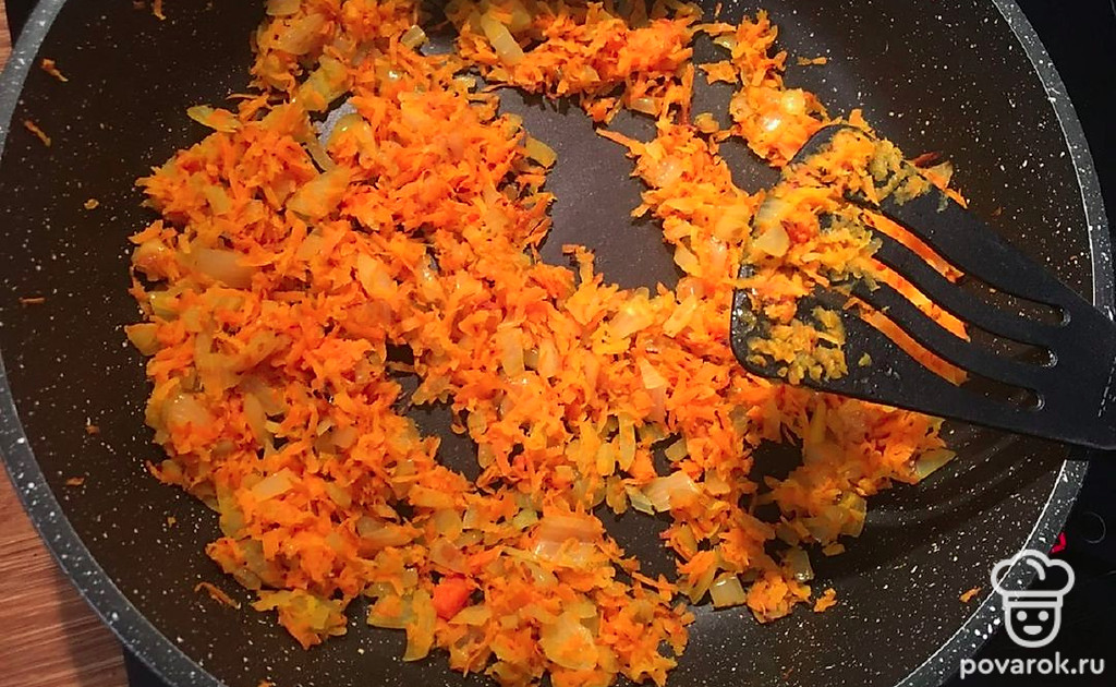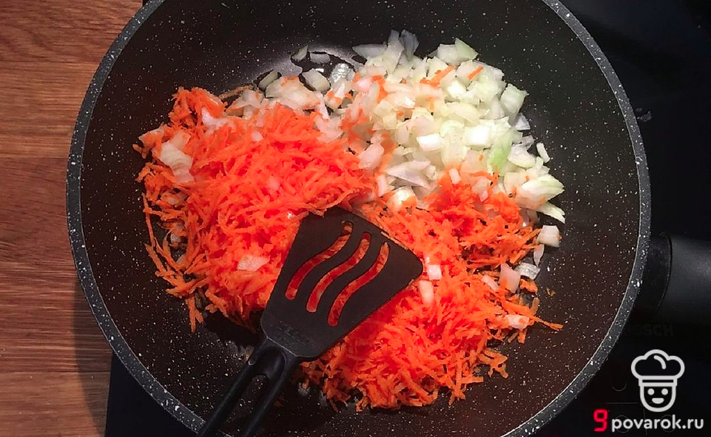 Налейте на сковороду растительное масло для жарки и разогрейте ее в течение 2 минут. Добавьте лук и морковь.