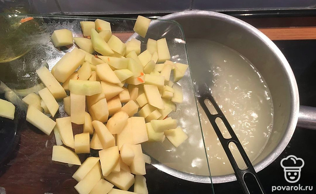 Почистите овощи. Картофель нарежьте кубиками, лук мелко нашинкуйте, морковь натрите на терке.