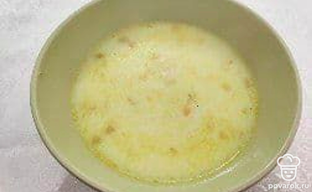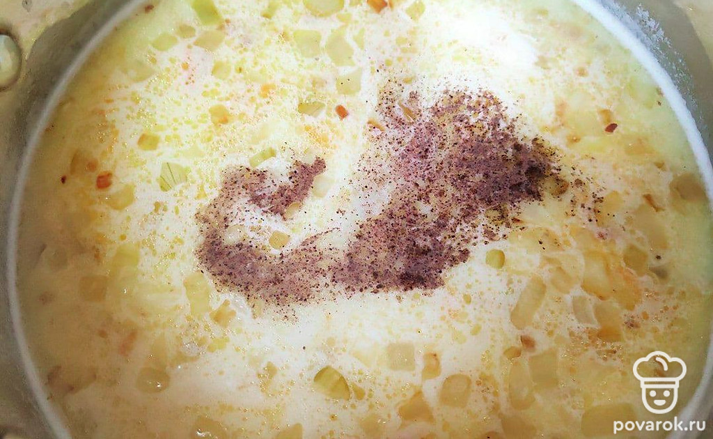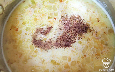 К готовому куриному мясу добавьте мелкие макароны. Затем влейте молоко, но все, примерно 200 мл (т.е. 2/3 части от общего количества молока по рецепту). После того как смесь закипит в очередной раз, высыпите обжаренные на сливочном масле овощи. Как только суп закипит, сделайте меньше огонь, и продолжайте варить суп примерно 6-7 минут. Крахмал добавьте в молоко, которое осталось. Хорошо перемешайте крахмал в молоке, чтобы не было комочков. Получившуюся смесь добавьте в кастрюлю с готовящимся супом. Закипятите еще раз суп и продолжайте варить примерно 2-3 минуты. В суп добавьте специи: соль, перец. Все хорошо перемешайте.
