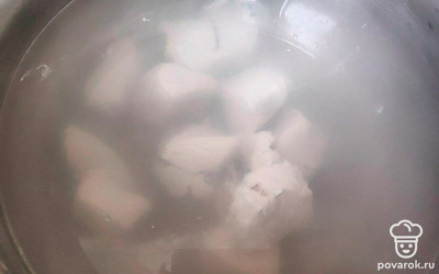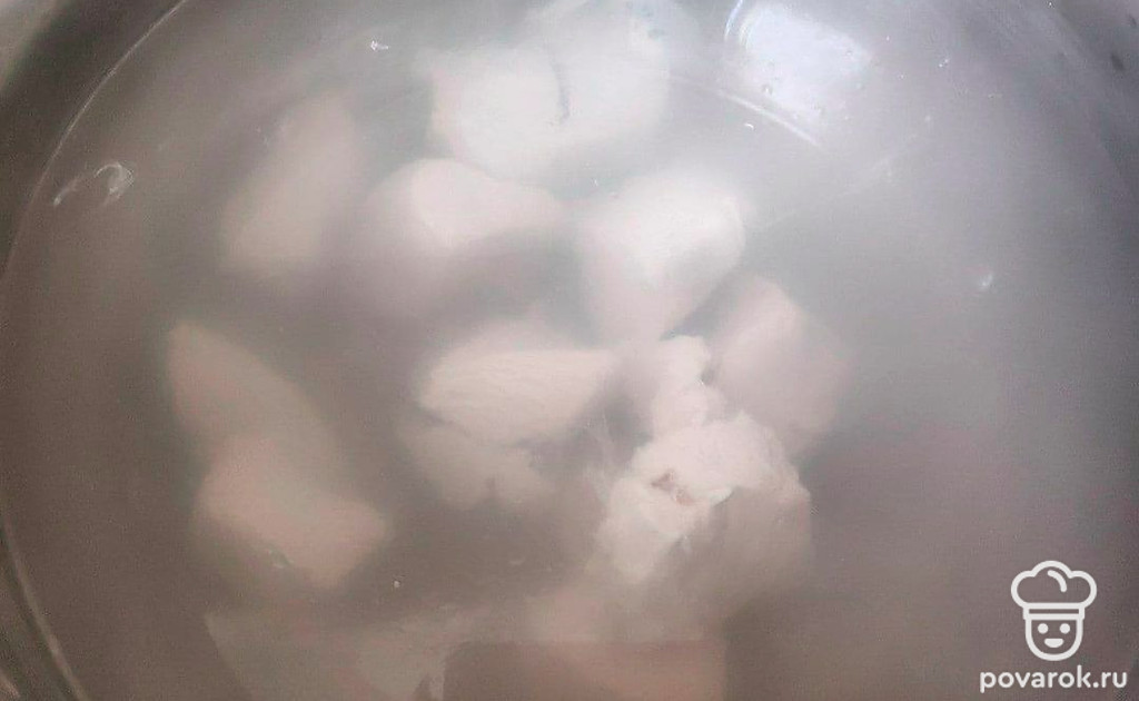 Нарежьте небольшими кусочками куриное мясо. В кастрюле вскипятите воду. В кипящую воду положите нарезанные кусочки филе. После того как вода закипит, варите мясо до готовности, примерно 20-25 минут.
