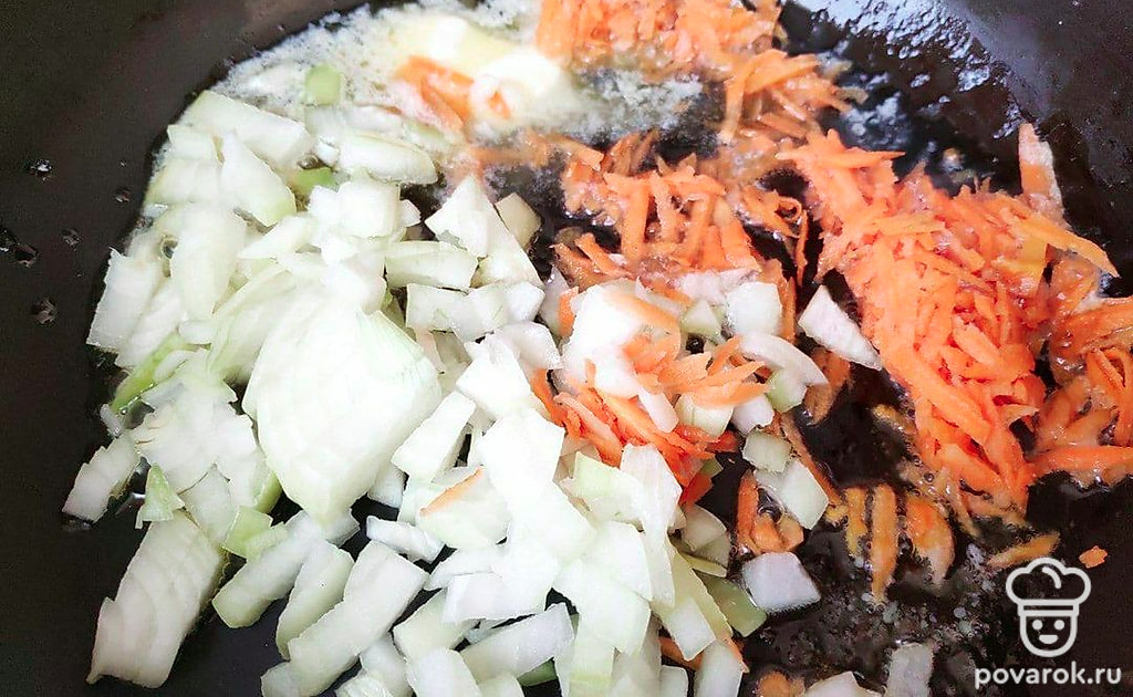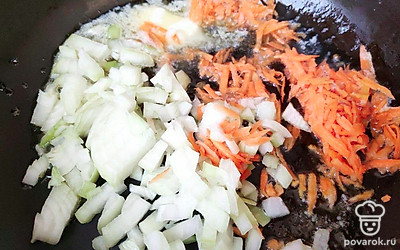 Лук нарежьте мелкими кусочками (кубиками), при помощи крупной терки измельчите морковку или нарежьте ее тонкой соломкой. Разогрейте сковороду и растопите в ней масло. В сковородку добавьте нарезанный лук, обжаривайте его до прозрачности, примерно 3-4 минуты. Затем высыпьте измельченную морковь, и продолжайте обжаривать до мягкости, примерно 4-5 минут, постоянно помешивая.
