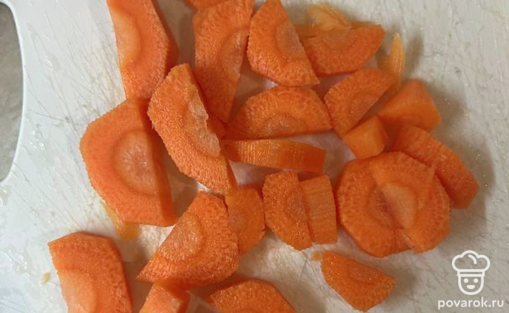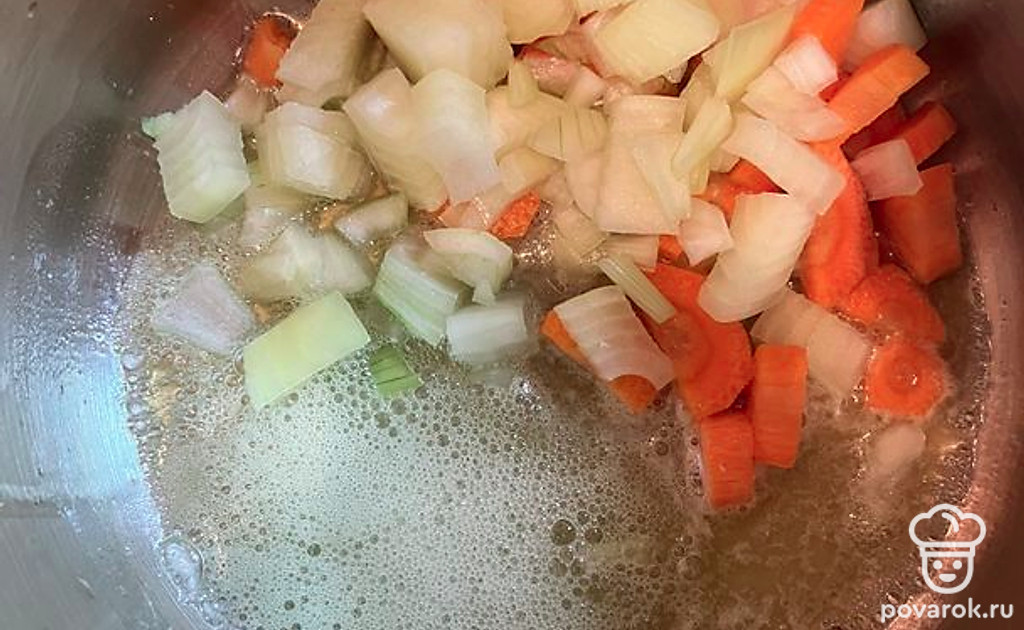 В кастрюлю положите морковь и лук, обжаривайте 5-7 минут, постоянно помешивая.