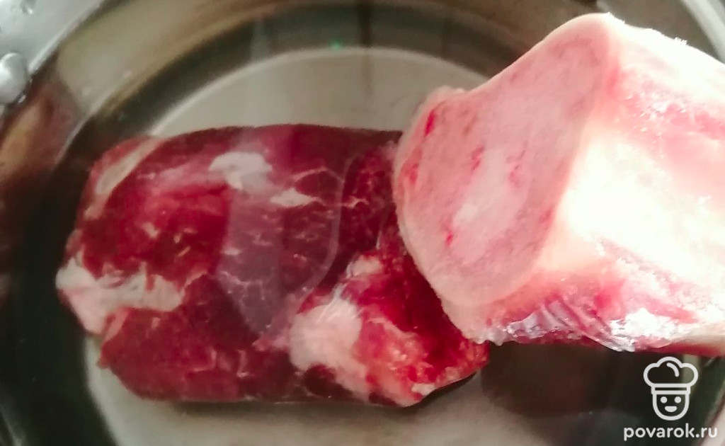 Говядину на кости залейте холодной водой и поставьте на медленный огонь на 2 часа.