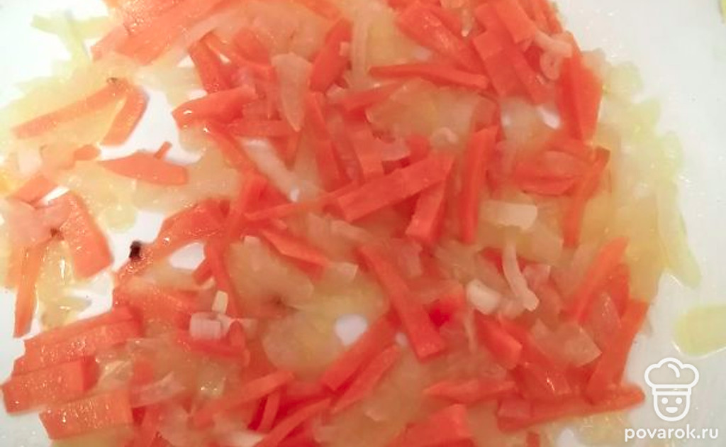 Пока варится говядина, в другой кастрюле сделайте зажарку из моркови и лука. Обжаривайте на растительном масле до золотистого цвета.