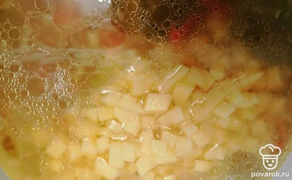 Добавьте в суп нарезанную картошку. Варите до готовности.
