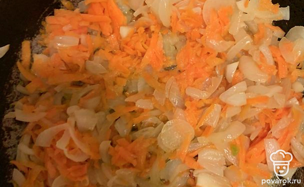 Нарежьте лук и морковь. Обжарьте лук до золотистого цвета, добавьте морковь, жарьте 5 минут. Добавьте в кастрюлю и перемешайте.