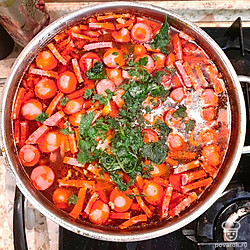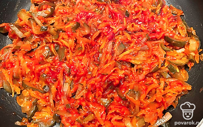 Выложите в кастрюлю обжаренные овощи в томатной пасте. Варите 15 минут.