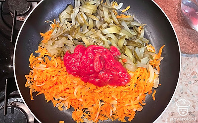 Добавьте к овощам нарезанные огурцы и томатную пасту.