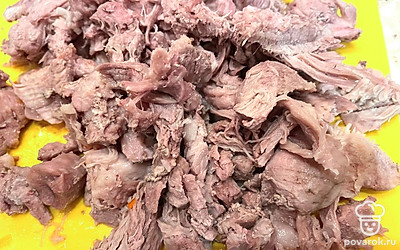 Достаньте мясо из бульона. Нарежьте на кусочки и верните обратно в кастрюлю.