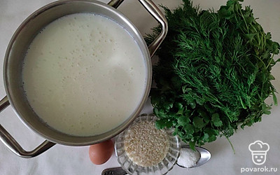 Затем добавьте рис и влейте тонкой струйкой яйцо. Все время помешивайте, не давая кефиру свернуться. Когда рис будет почти готов, всыпьте всю нарубленную зелень и посолите. Проварите, помешивая, еще пару минут и снимите с огня.