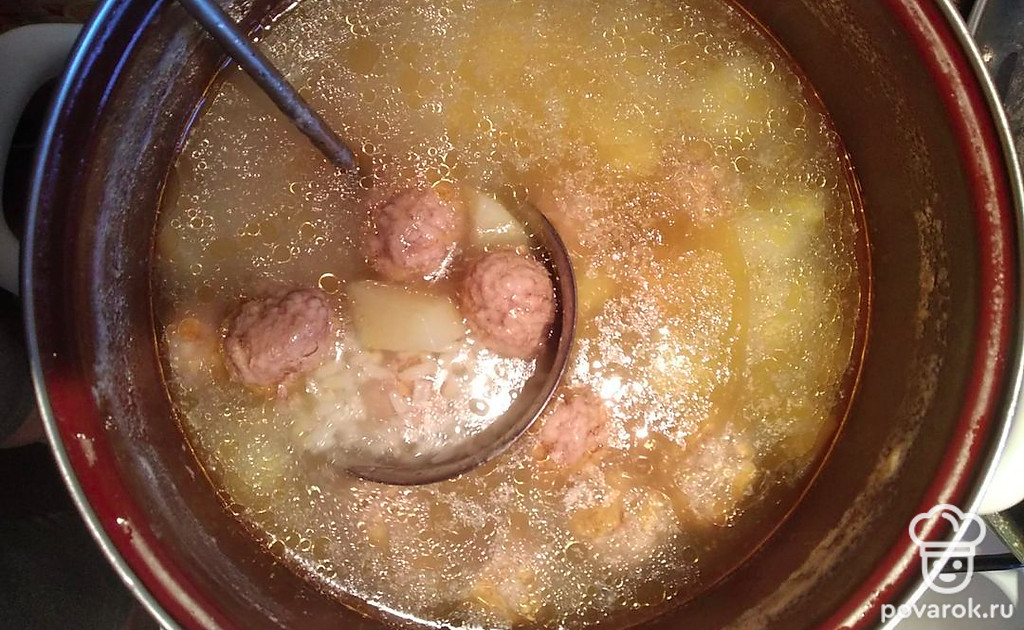 Наливаем в кастрюлю воду, ставим на плиту. Формируем фрикадельки и кладем в воду.