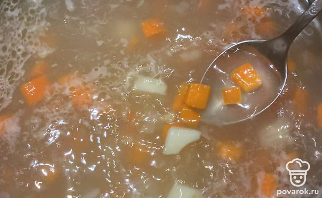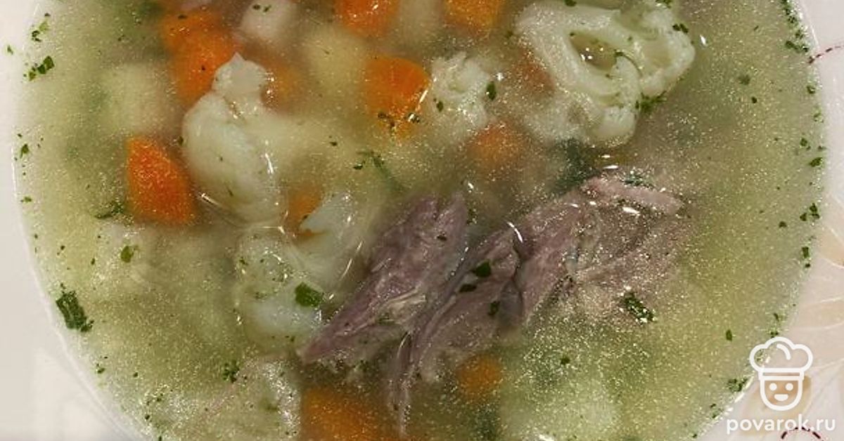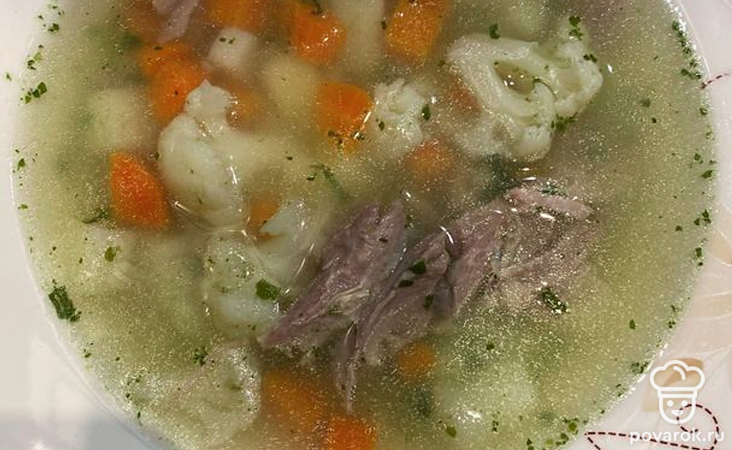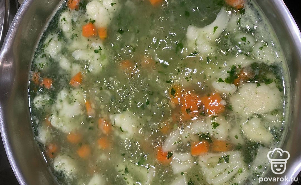 Запустите в готовый бульон морковь, затем через 5 минут картофель, через 10 минут цветную капусту и шпинат. Варите до готовности ещё 10 минут.