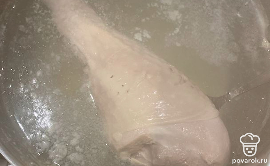 Отварите голень индейки в большой кастрюле 60 минут. Посолите.