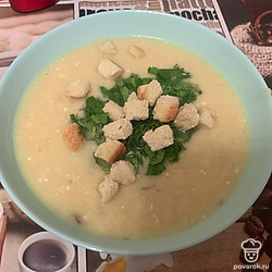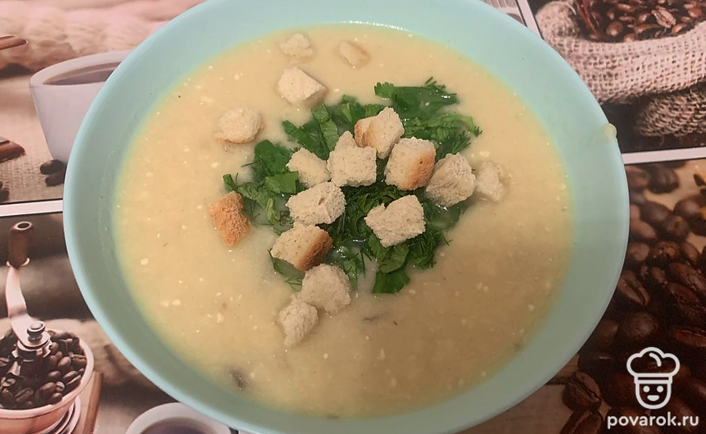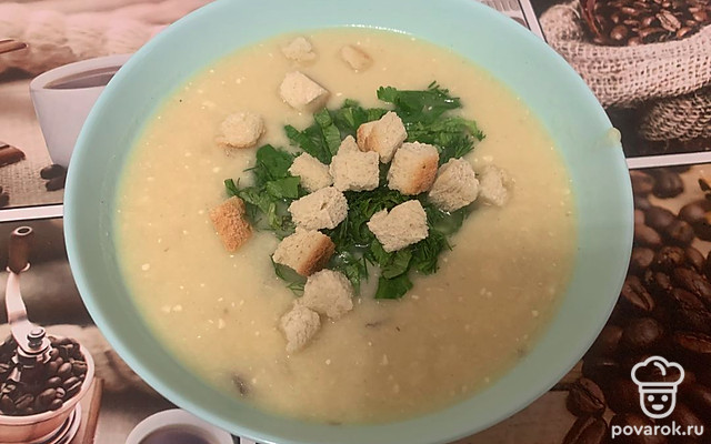 Подаем суп порционно, украсив нарезанной зеленью и сухариками.