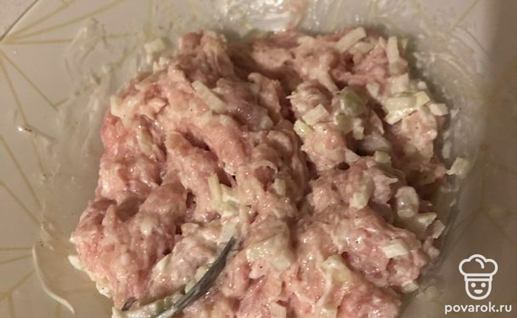 В фарш добавьте соль, перец, сметану, мелко нерезаный лук и перемешайте.