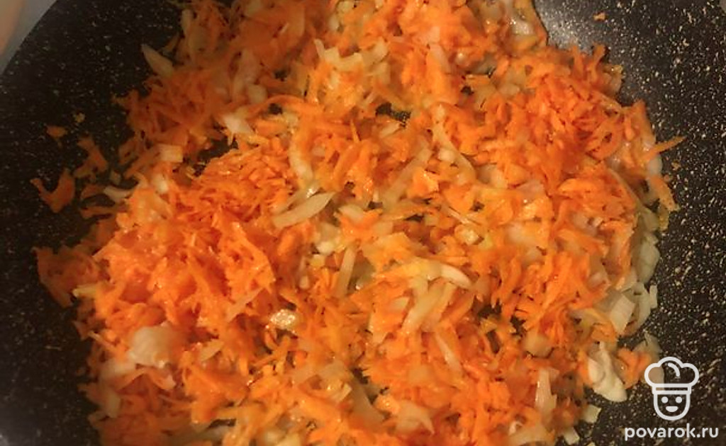 Обжарьте лук и морковь и добавьте в бульон.