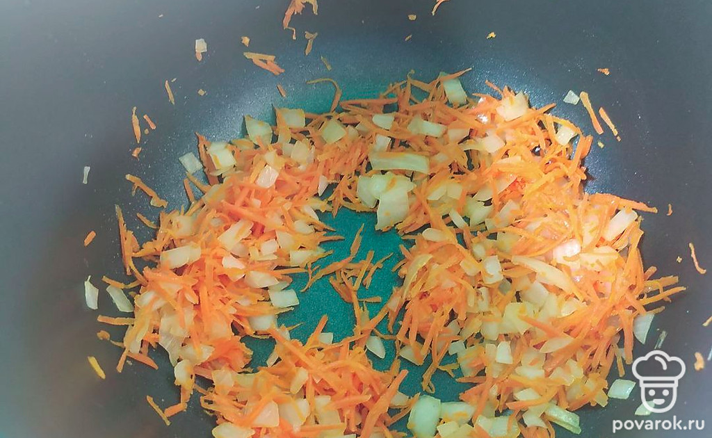 Репчатый лук мелко порезать, морковь натереть на терке и обжарить все вместе в небольшом количестве растительного масла.