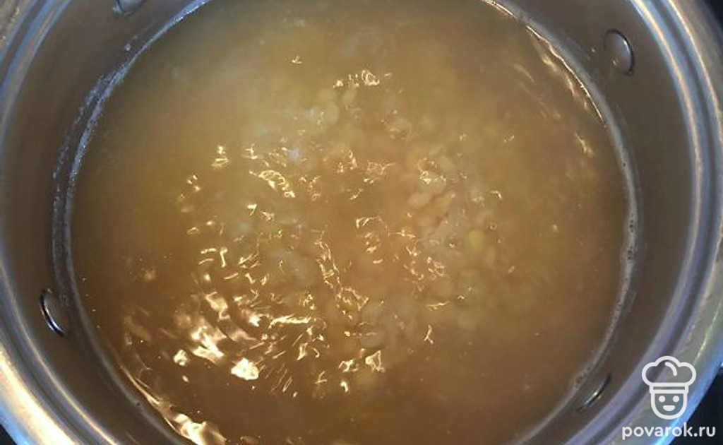 Замоченный горох погрузить в бульон и варить 10 минут.