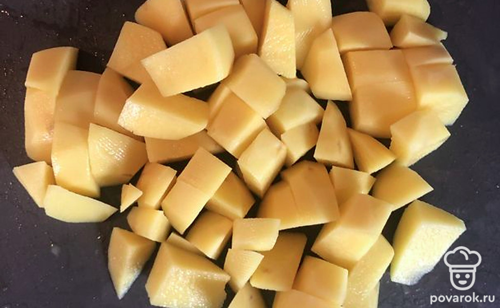Положить в кастрюлю нарезанный картофель, варить около 10 минут.