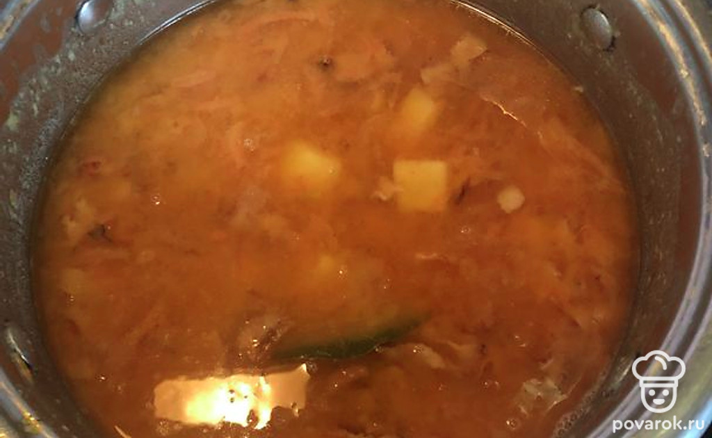 Переложить зажарку в кастрюлю, добавить соль, чёрный перец, лавровый лист и варить до готовности.
