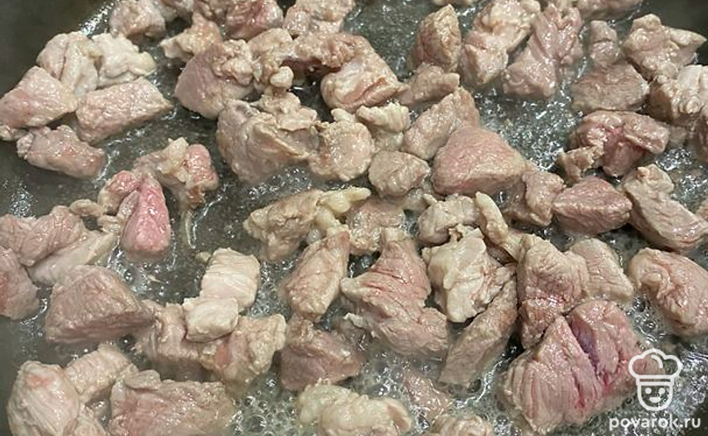 Пока бульон закипает, в сковороде обжарьте мелко нарезанную вырезку.