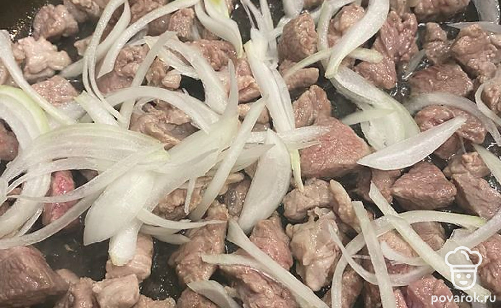 Добавьте к мясу лук, перемешайте, обжарьте 5 минут.