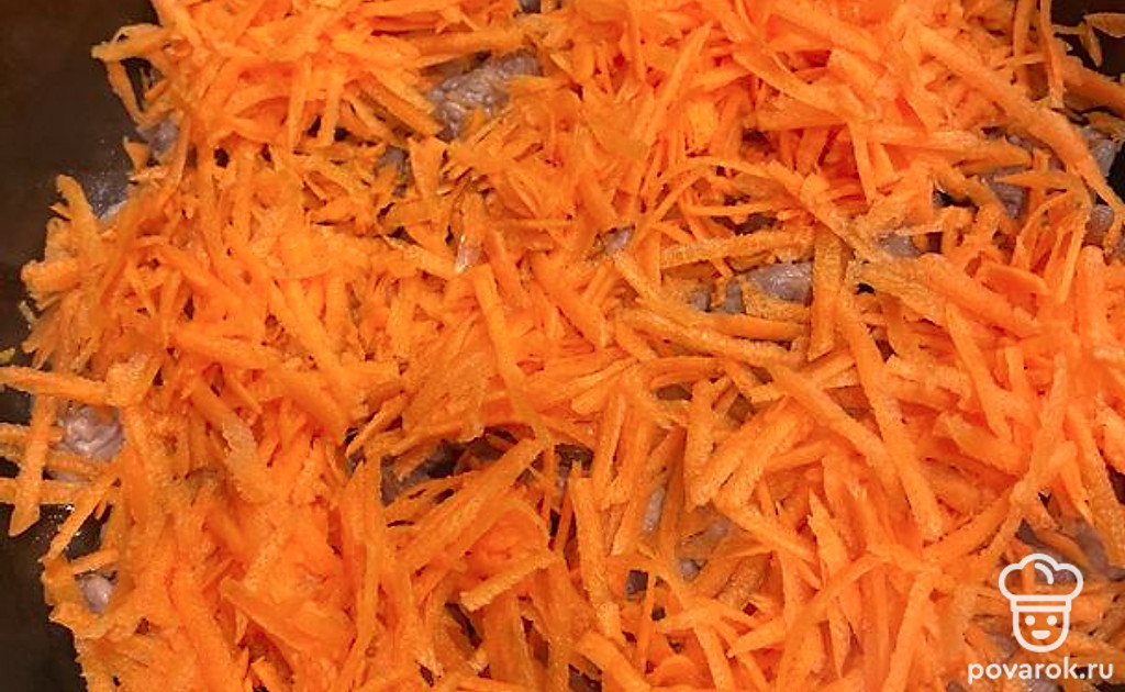 Добавьте морковь, обжарьте, помешивая, 10 минут.