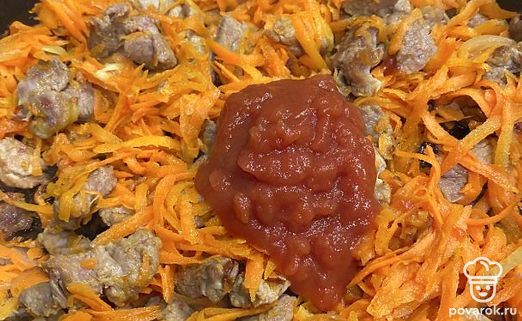 Добавьте томатную пасту, перемешайте, обжарьте 5 минут.