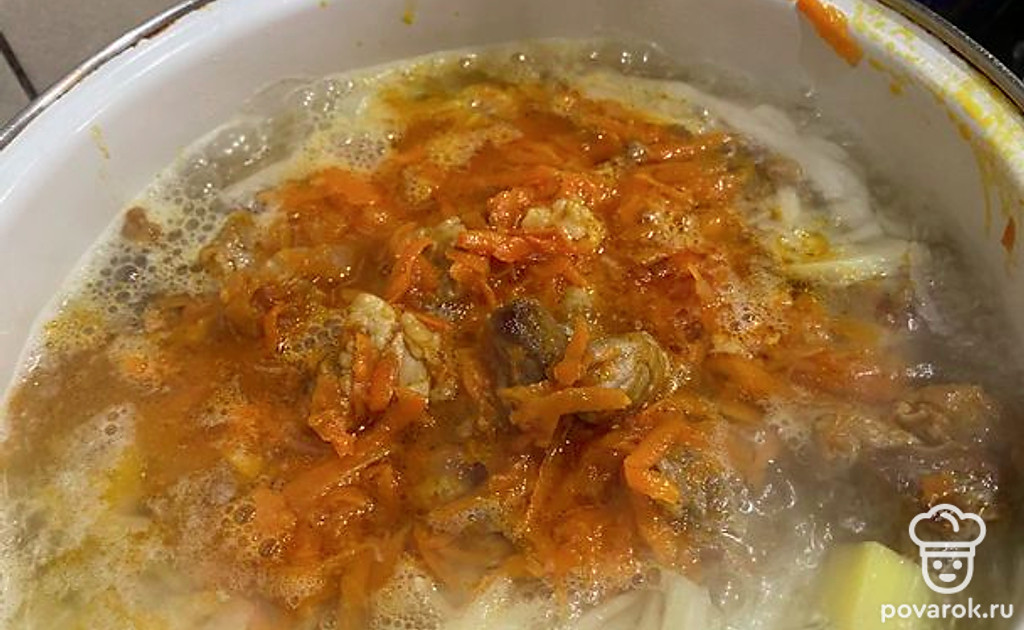 В бульон с картошкой и капустой добавьте пережарку, варите на медленном огне 20-25 минут.