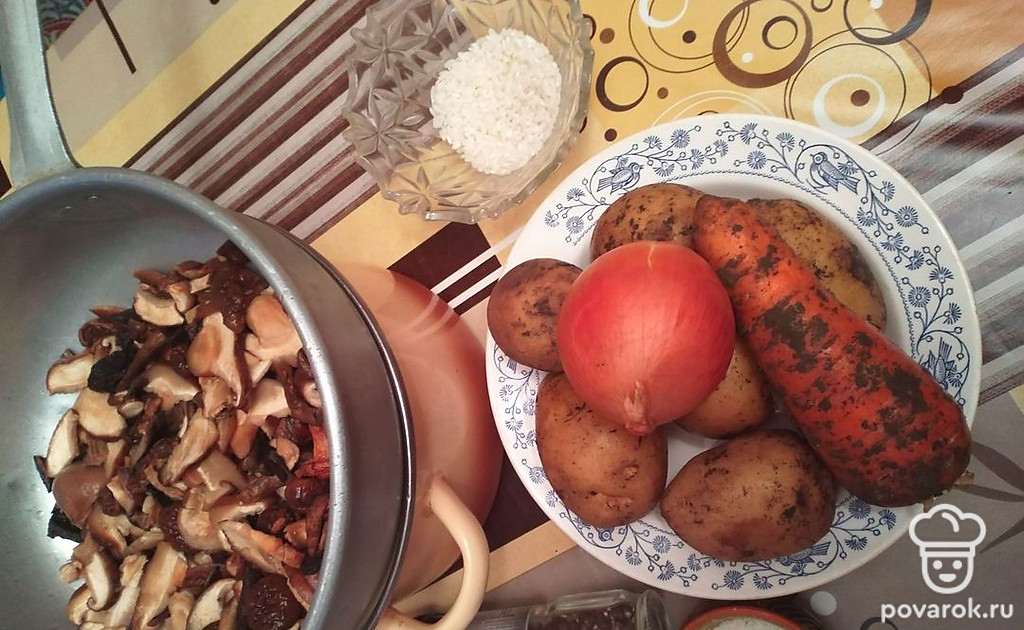 Овощи почистить, помыть. Сушёные лесные грибы замочить на 1 час перед готовой, хорошо промыть несколько раз. Поставить варить. Через 40 минут заложить в бульон рис.