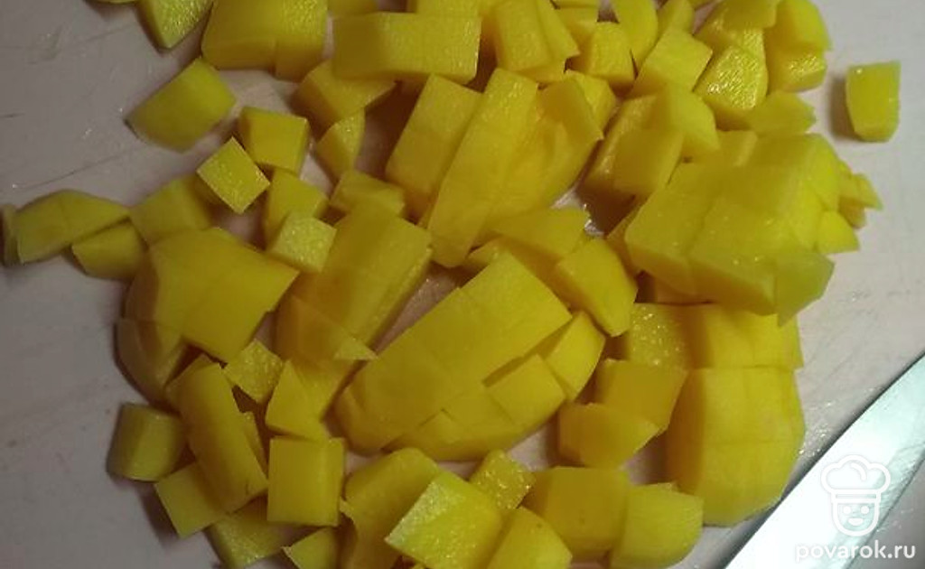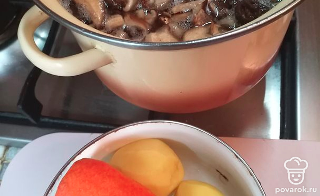 Картошку порезать на кубики и отправить в грибной бульон после часа варки.