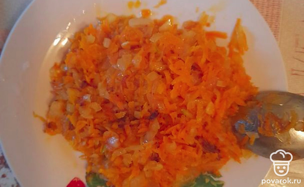На раскаленную сковороду налить 3 столовые ложки рафинированного подсолнечного масла и обжарить морковь и лук до золотистого цвета.