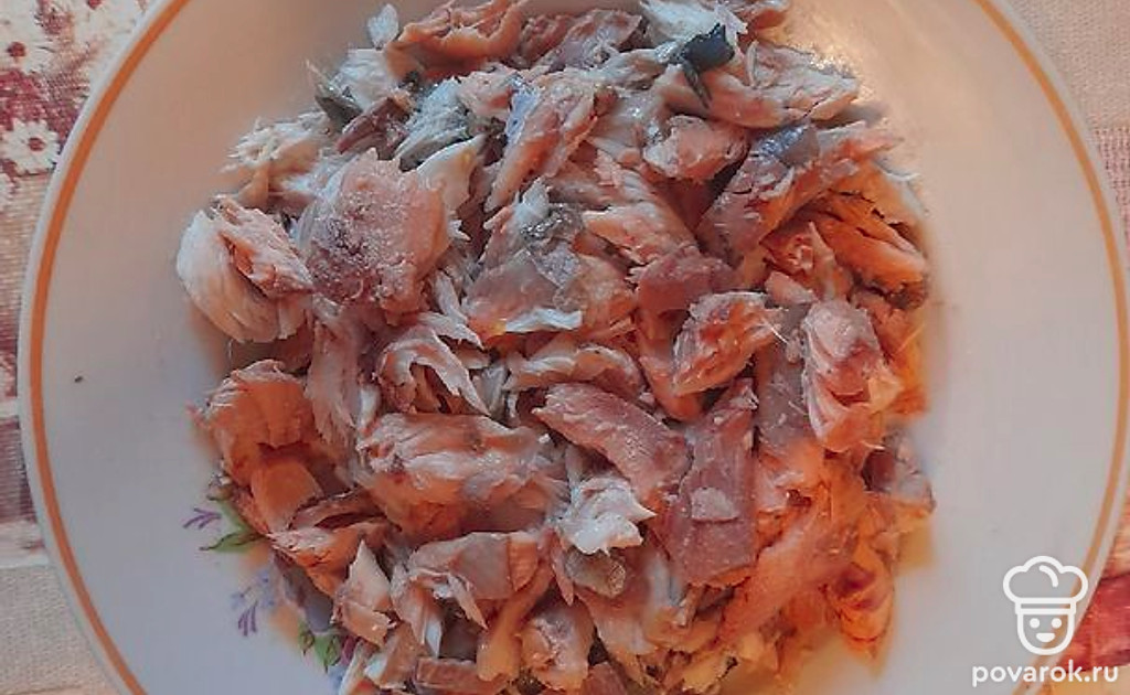 По истечении 50 минут, процедить бульон, отделить мясо от голов и костей.