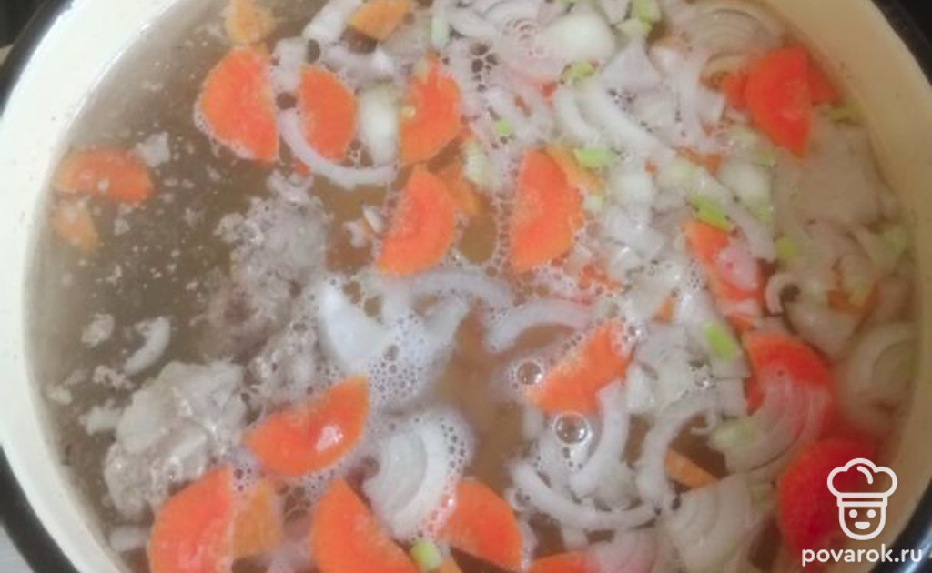 В готовый бульон с кусочками говядины добавить нарезанный лук и морковь.