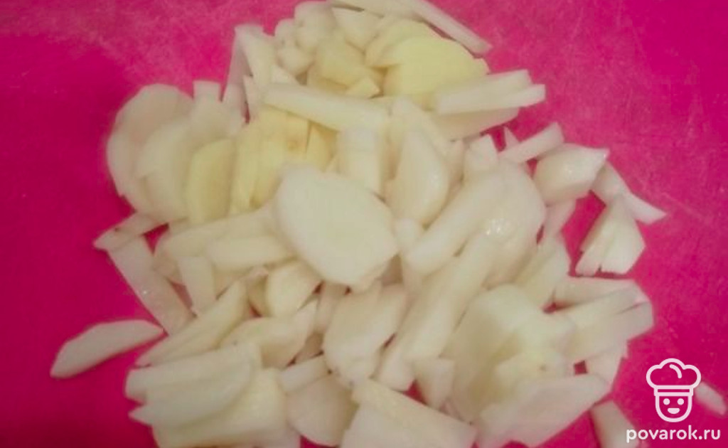 Также нарезать картофель брусочками и запустить в бульон к другим овощам.
