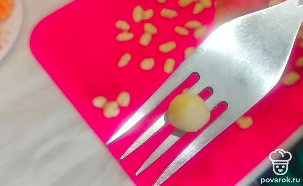 Как овощи будут готовы, из теста сделать завитки. В моем случае тесто заварное на кипятке, можно делать из теста, приготовленного как на пельмени. На вилку положить шарик из теста.