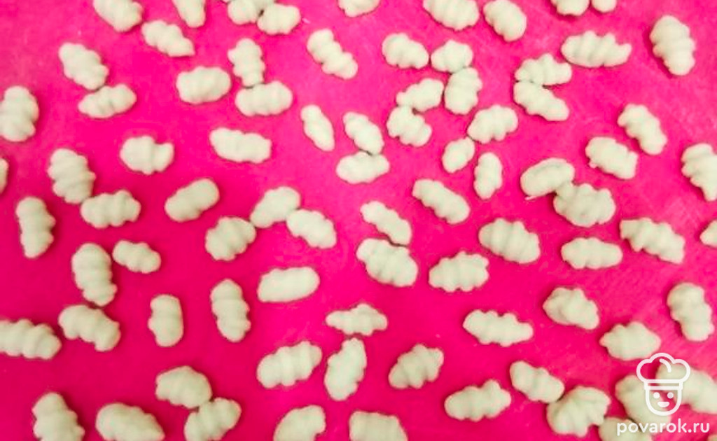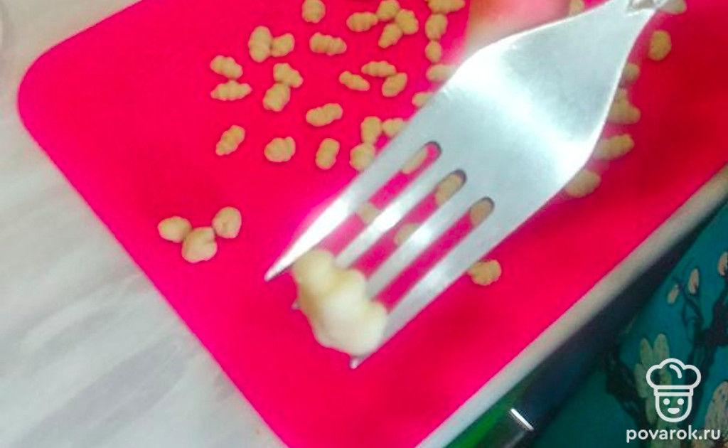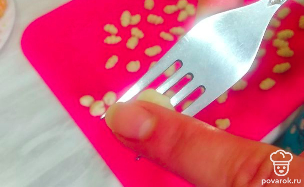 Пальцем прижать тесто и прокатывать его по вилке.