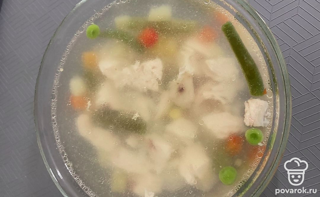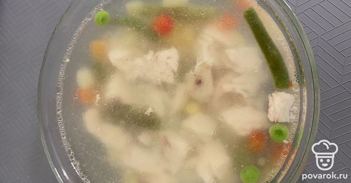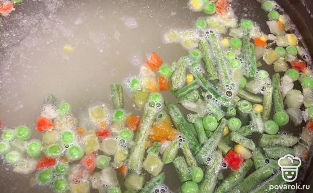 Засыпать мексиканскую овощную смесь и стручковую фасоль в бульон, варить 5 минут.