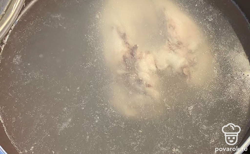 Варить грудку на медленном огне в течение 1 часа, выложить на тарелку.